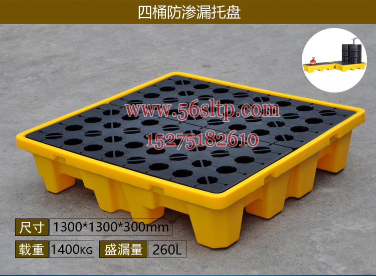 四桶装托盘正面 1.盛漏托盘整体采用无缝隙结构设计,防漏结构100%通过测试,完全避免泄漏的发生; 2.主体材质:线性低密度聚乙烯,具有良好地耐酸碱腐蚀的材质, 3.杜绝化学品泄漏时所可能产生的危害,可在户外使用; 4.当出现泄漏时,所有液体将会沿托盘格栅自动注入托盘盛漏区域内,不会污染现场环境; 5.双叉车插口便于搬运; 6.导液口设计,方便集中清理泄露液体; 7.盛漏托盘有不同型号可供您选择,便于您合理规划化学品或对化学品仓库进行整改时使用; 8.提醒您:当现场发生化学品泄漏时,如果泄漏的液体全部集中于托盘内部,请专业人员即时清理; 9.如果泄漏的区域出现扩散,请专业人员使用相对应的化学品吸咐产品进行及时堵漏及吸收。 10美国环境保护署对盛漏托盘制定了严格的标准 EPA 40 CFR 264.175。